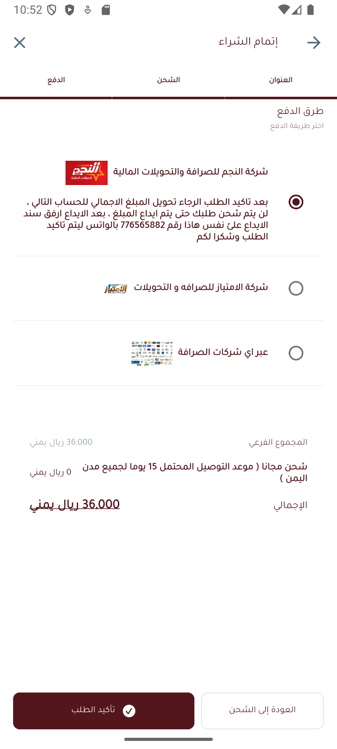بعد تاكيد الطلب الرجاء تحويل المبلغ الاجمالي للحساب التالي ، لن يتم شحن طلبك حتى يتم ايداع المبلغ ، بعد الايداع ارفق سند الايداع علئ نفس هاذا رقم 779811341 بالواتس ليتم تاكيد الطلب وشكرا لكم