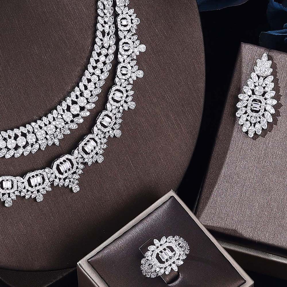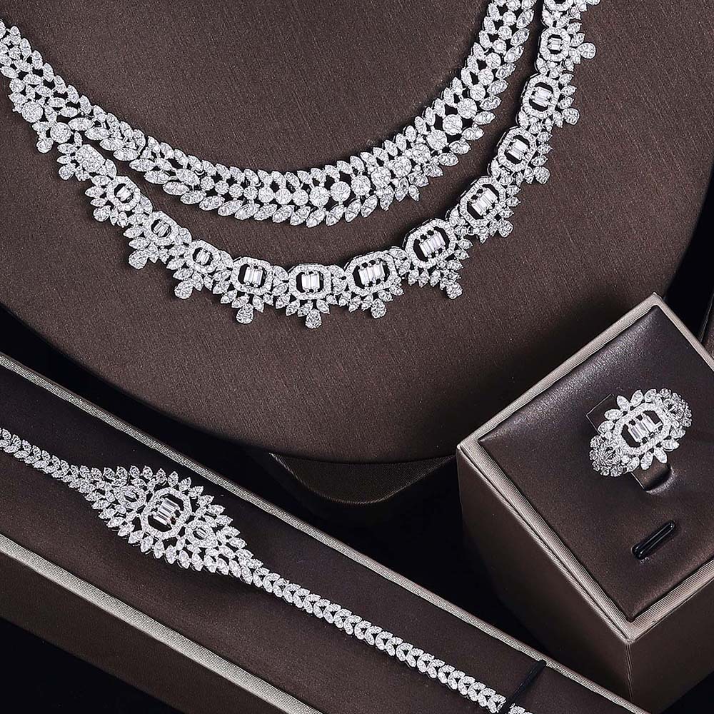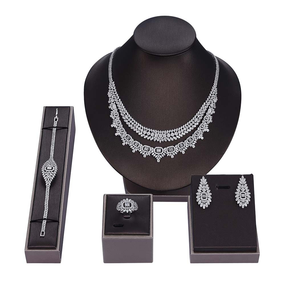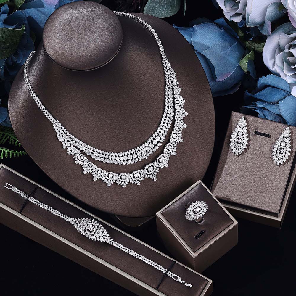 تخفيضات هائلة: طقم عقد وأقراط من الزركون للعرائس، مجوهرات نحاسية مرصعة بدقة متناهية، تصميم مزدوج الطبقات، إكسسوارات فستان زفاف quantity