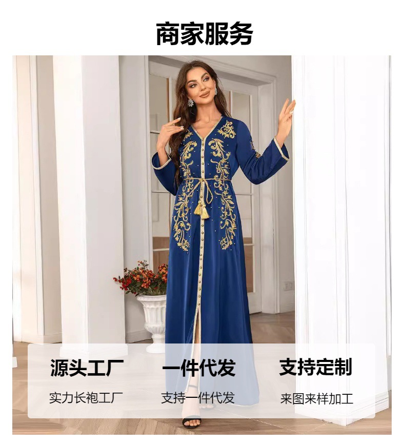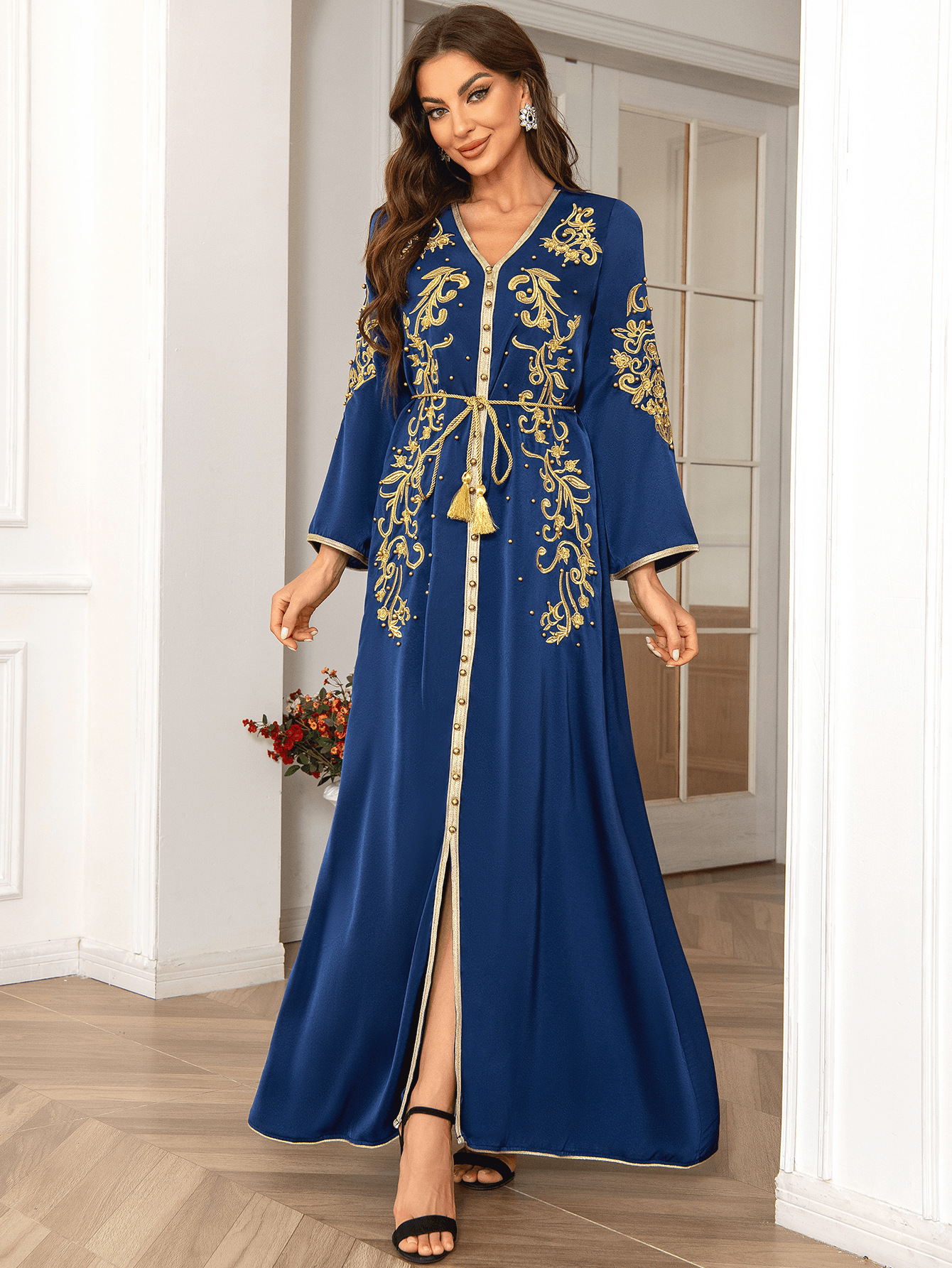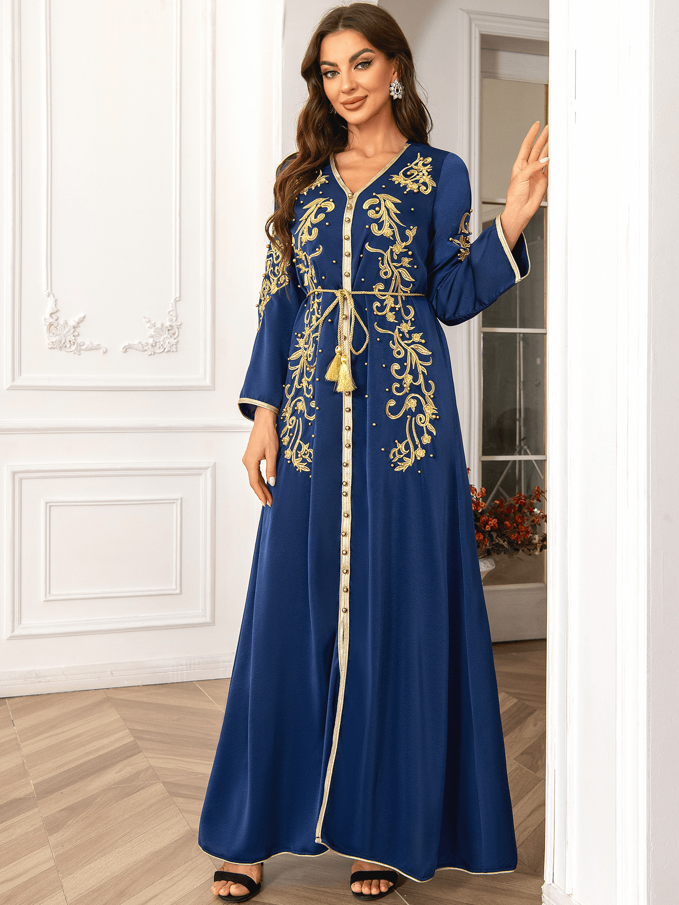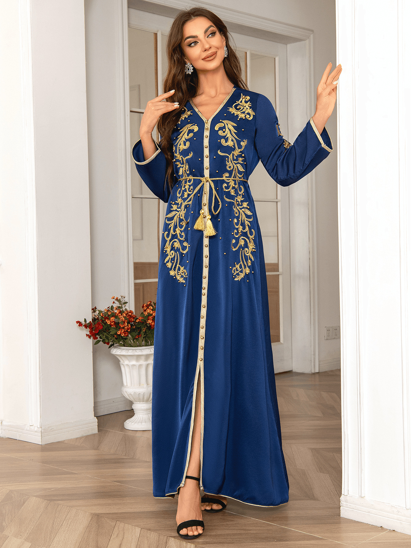 طويلة مزينة بتنانير طويلة نقشات ومطرزة بالذهب ومزينة بالخرز، أنيقة