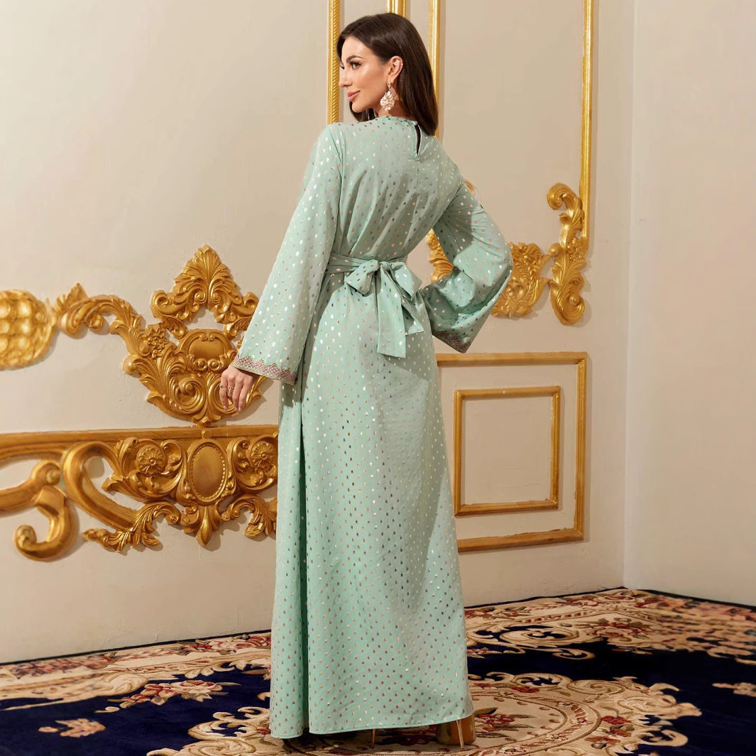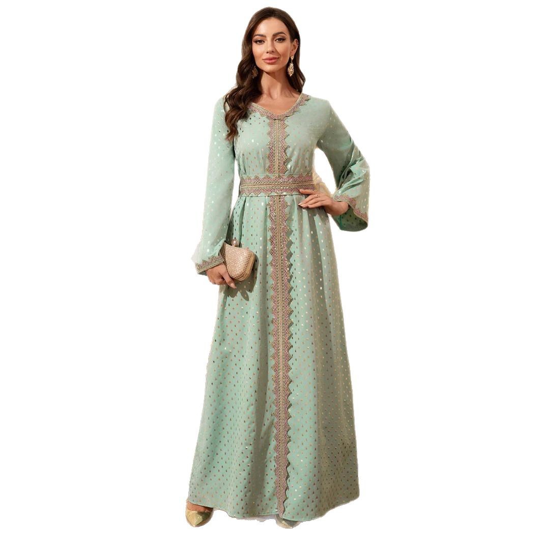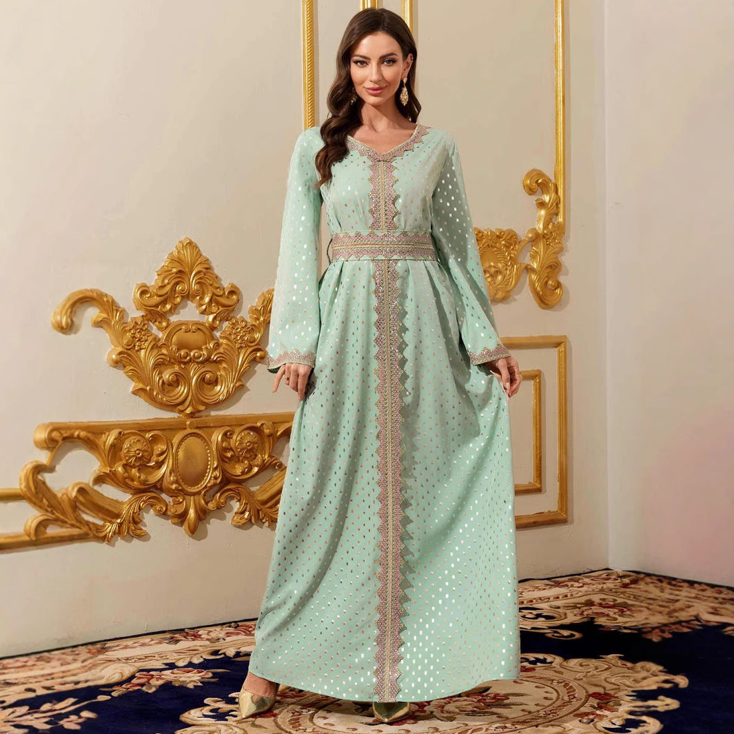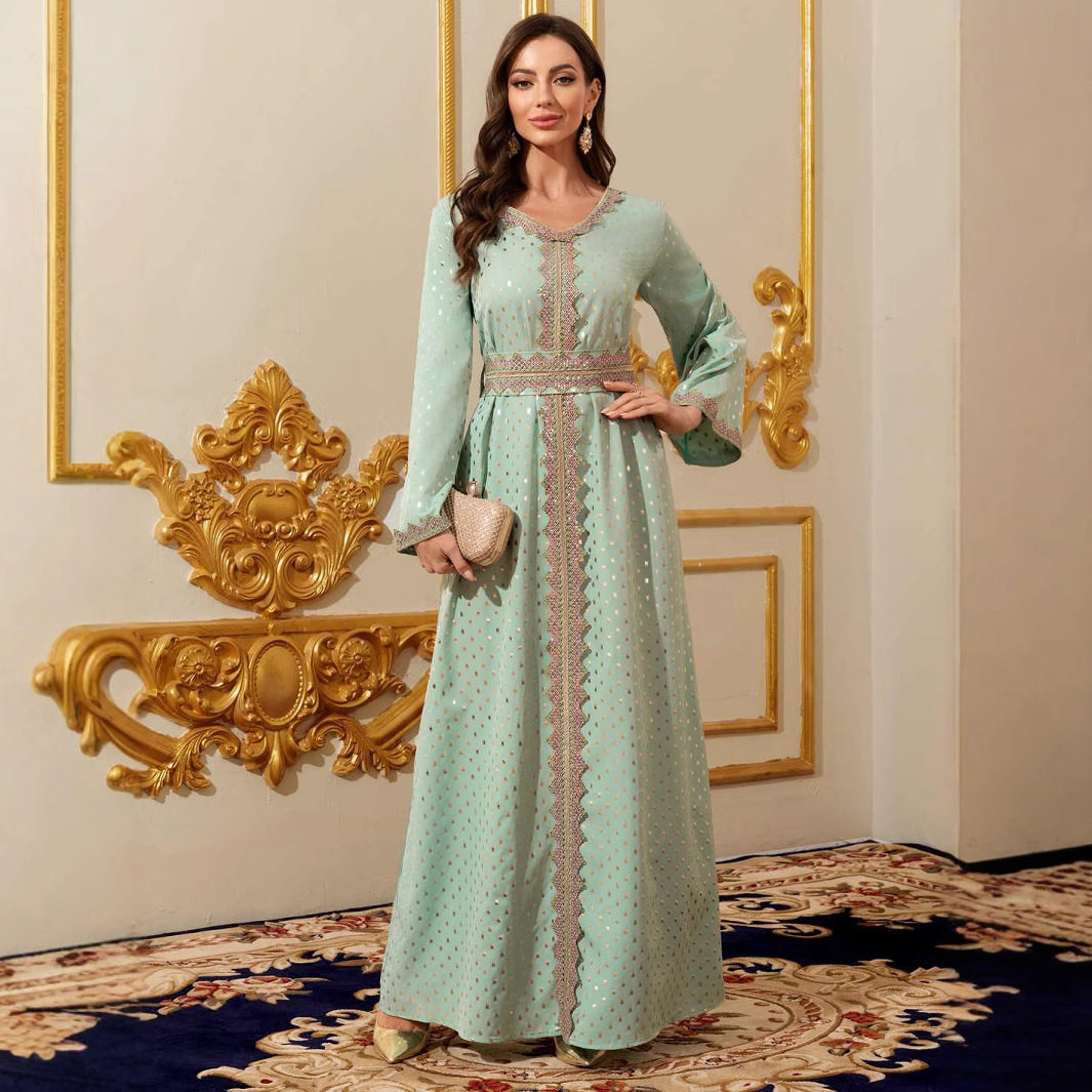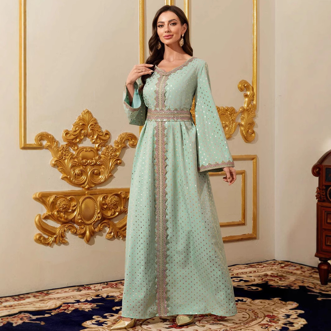 جلابية نسائية طويلة أنيقة، برقبة على شكل V وأكمام طويلة مع دانتيل.