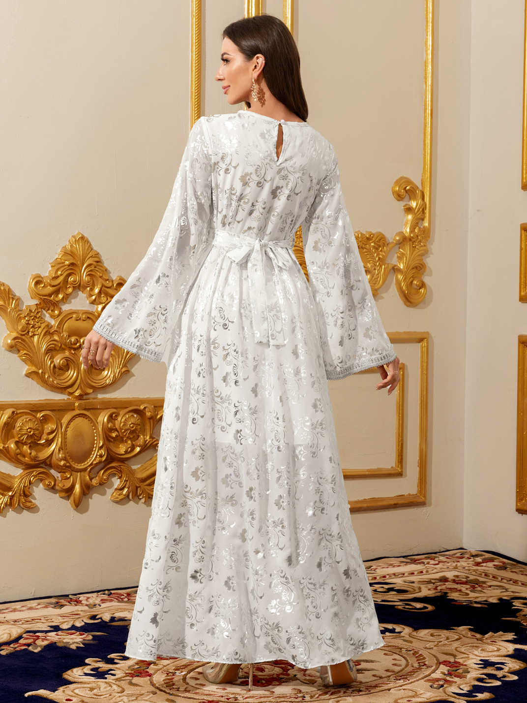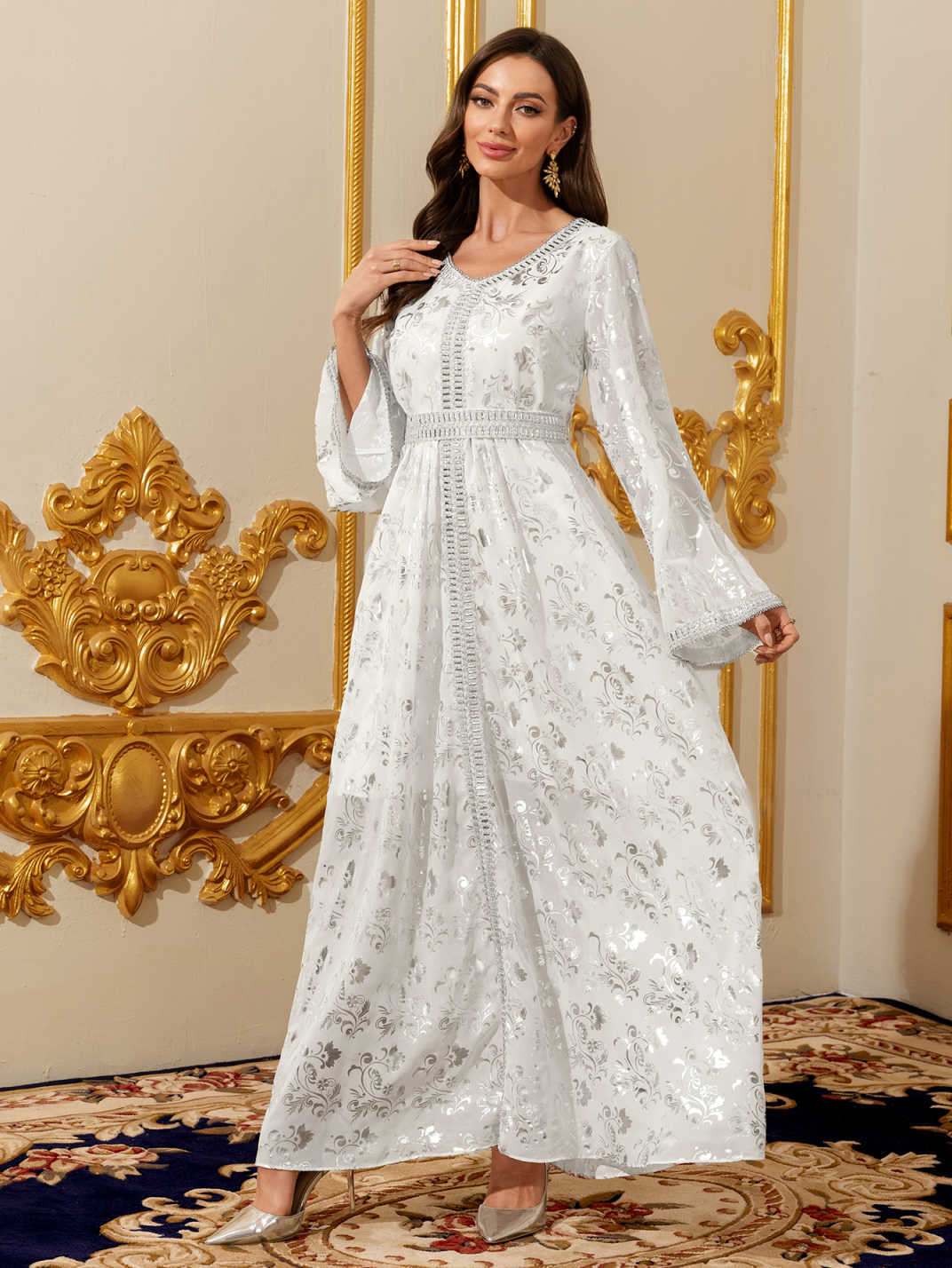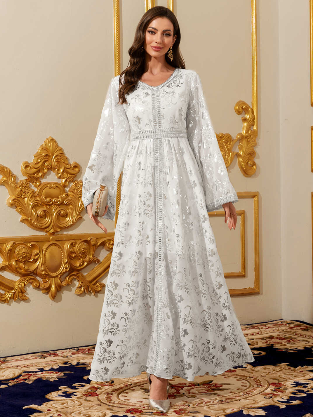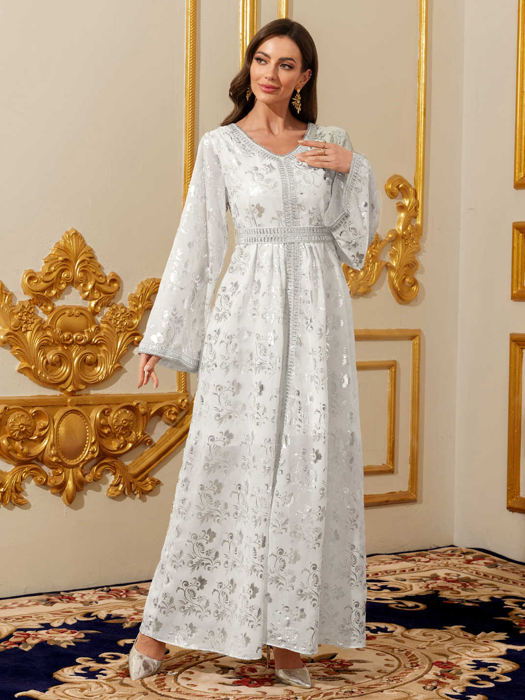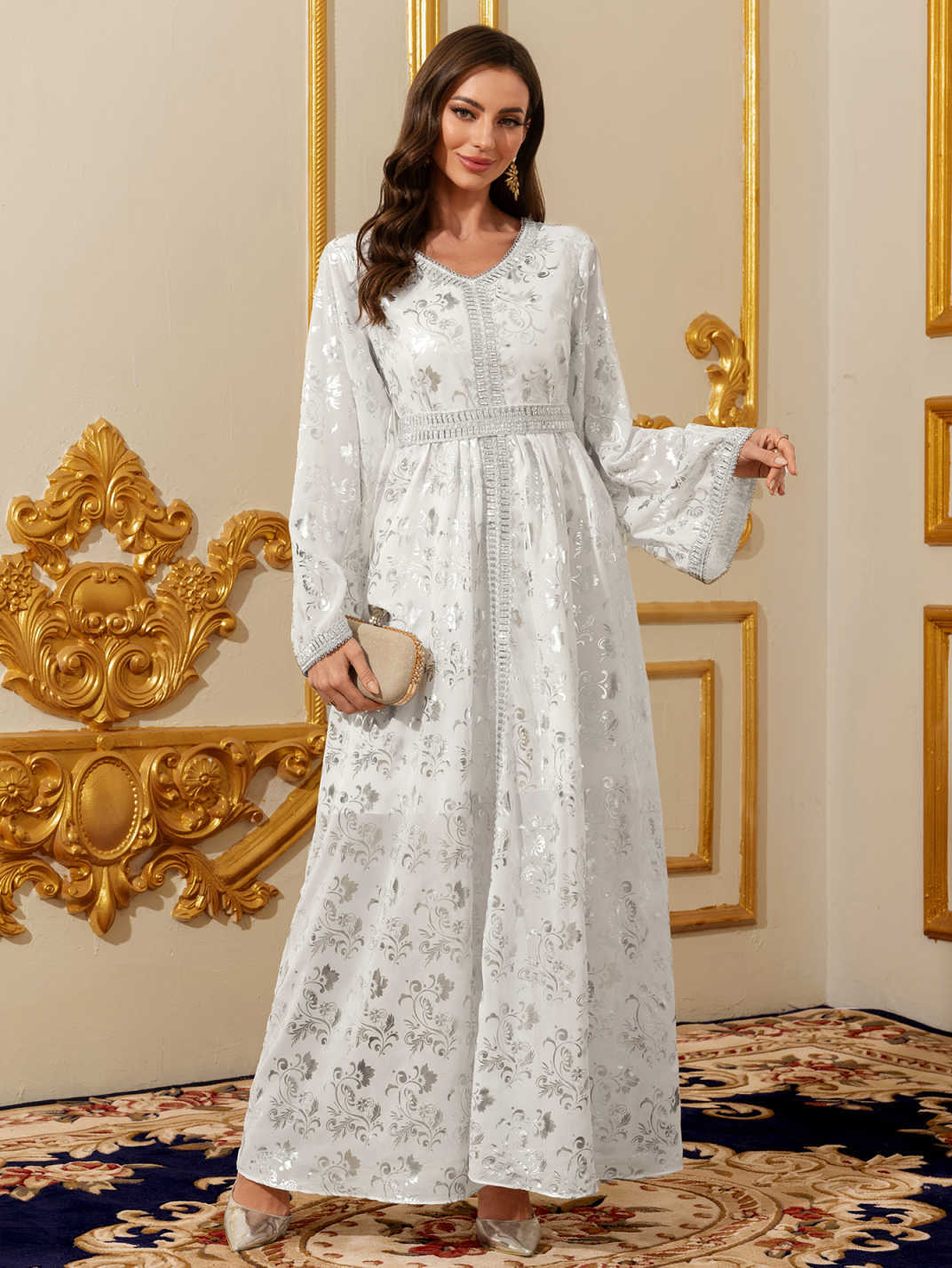 جلابية نسائية، برقبة على شكل V وأكمام طويلة، بتصميم معاصر. quantity