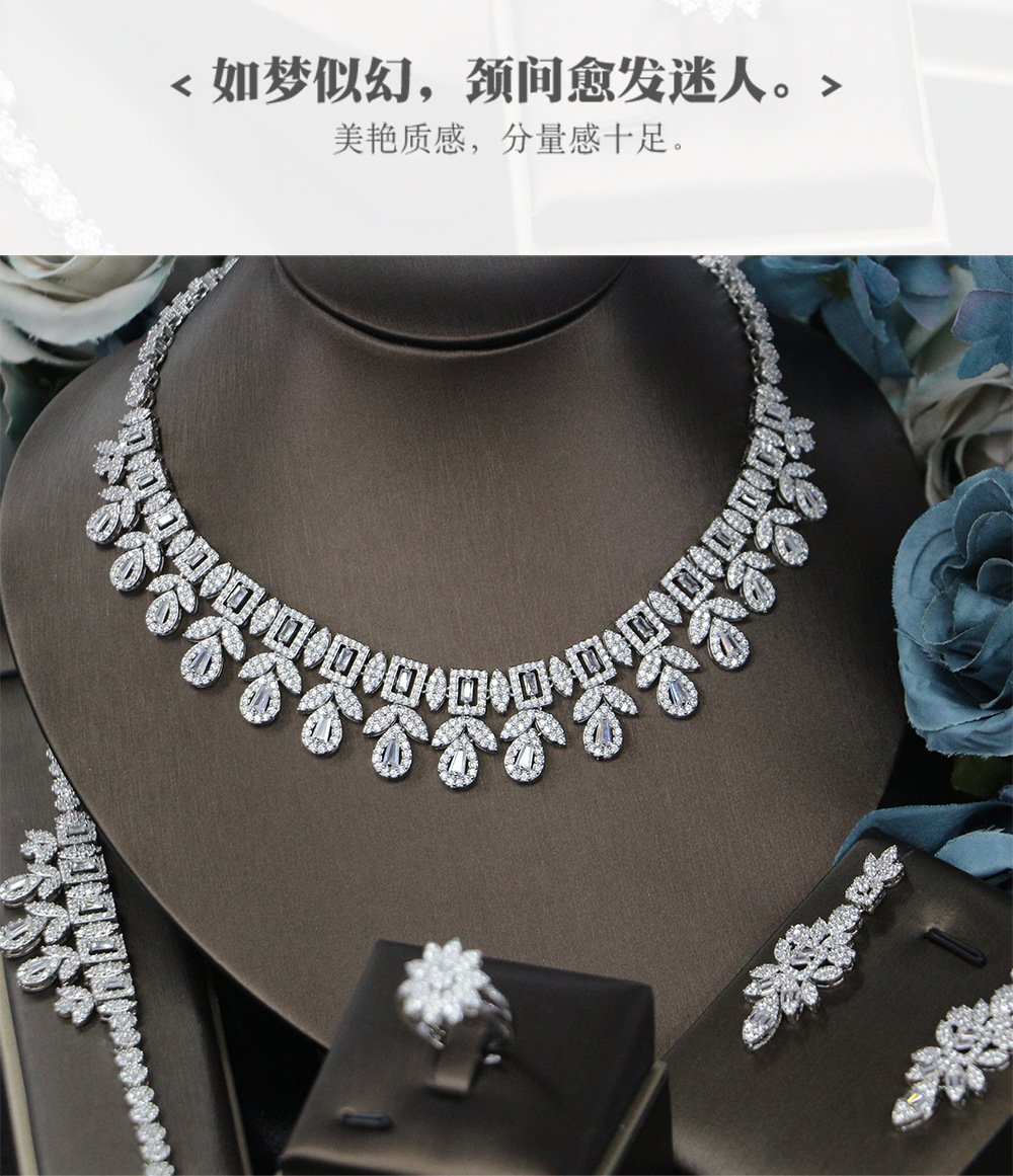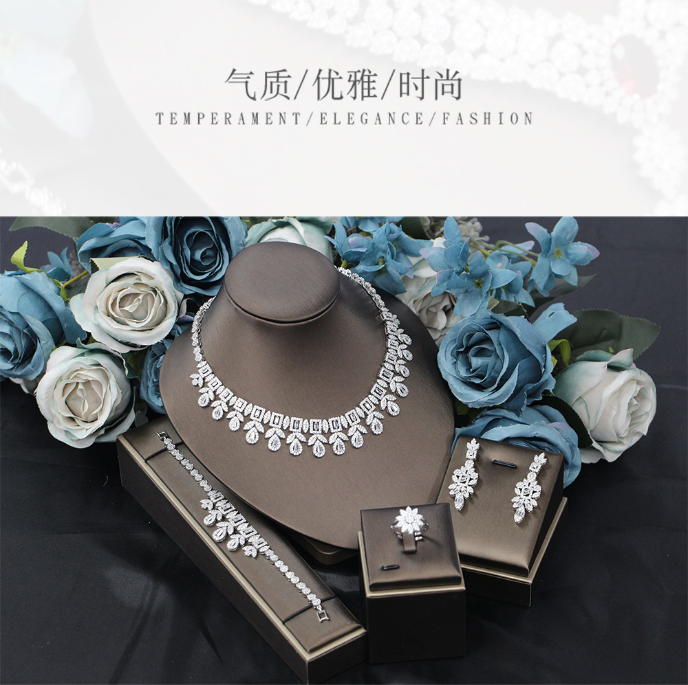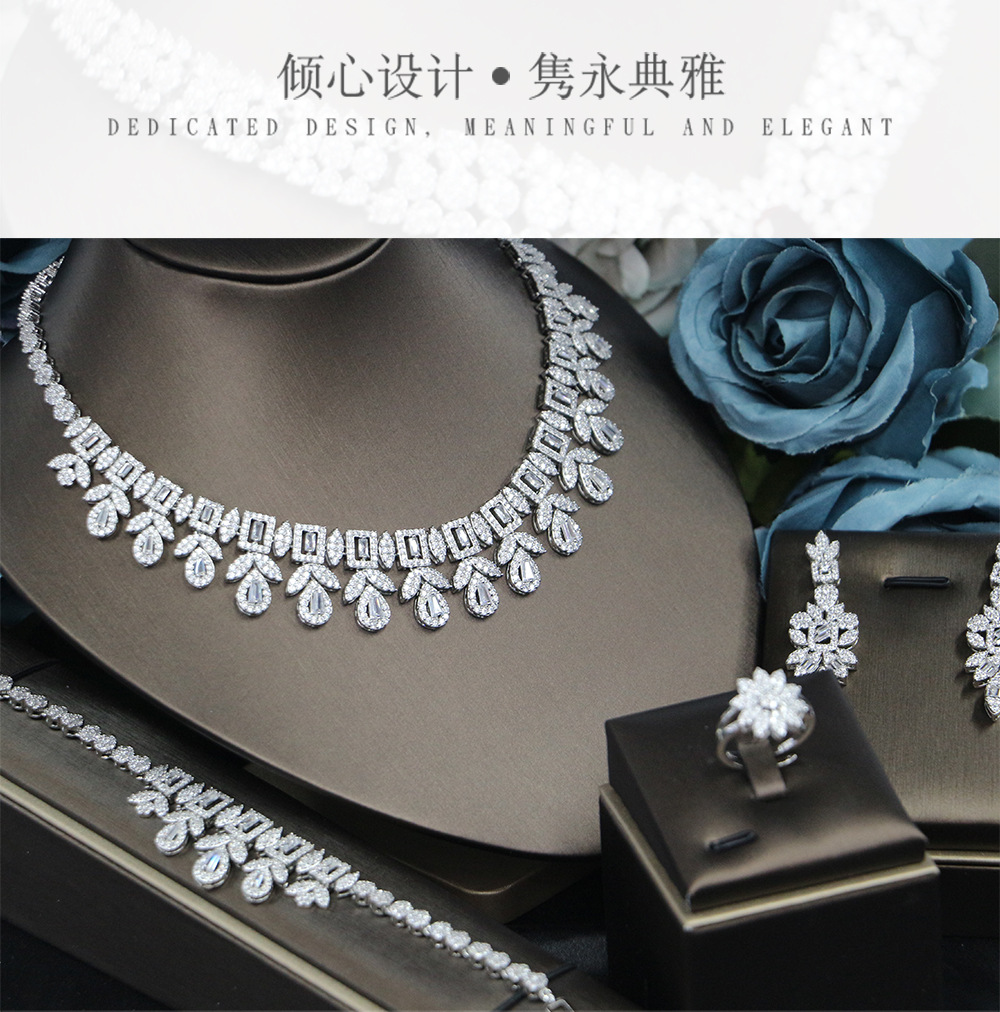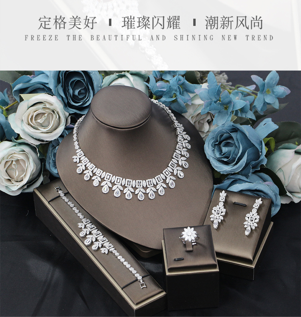 إكسسوارات فستان الزفاف، طقم من أربع قطع مرصع بالزركون: قلادة، أقراط، خاتم، سوار.
