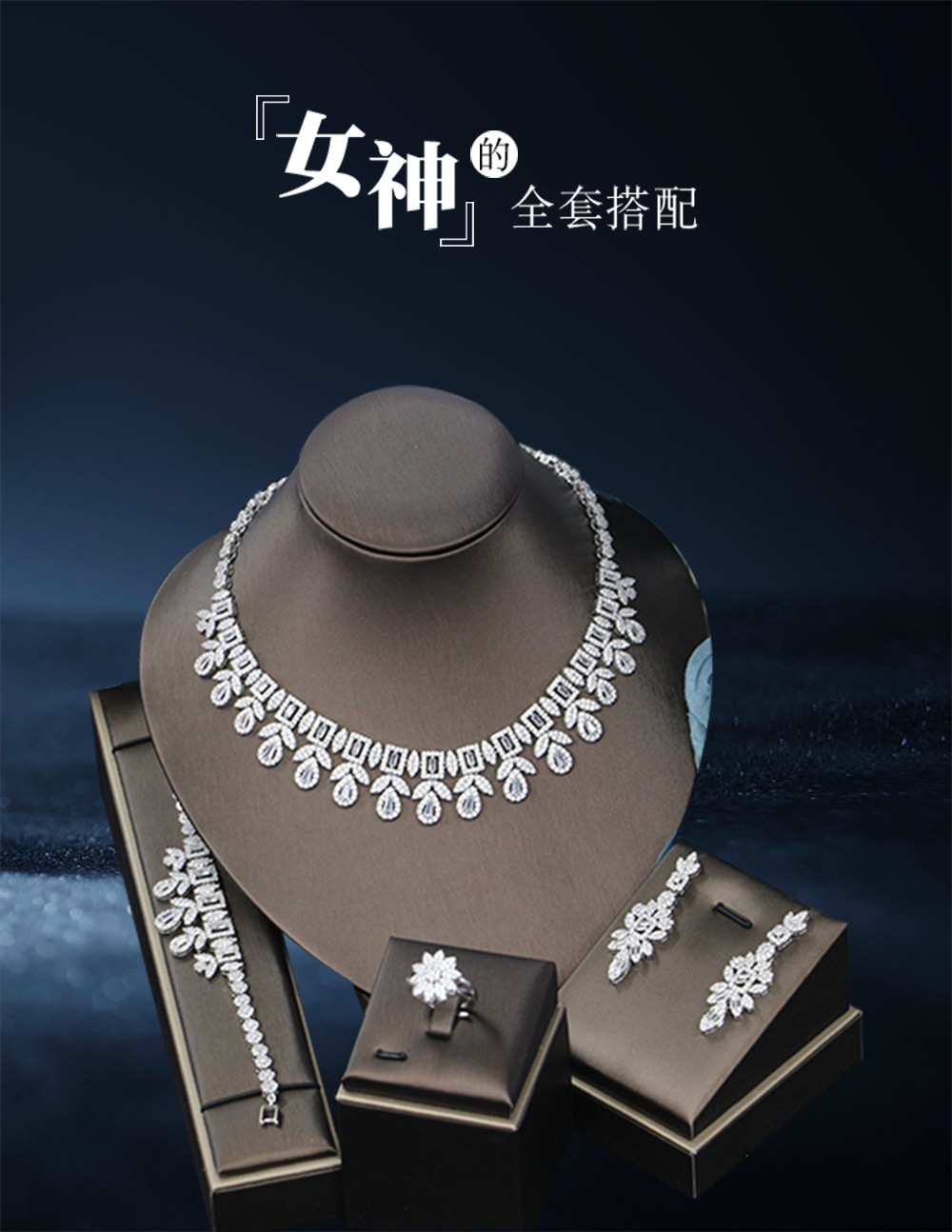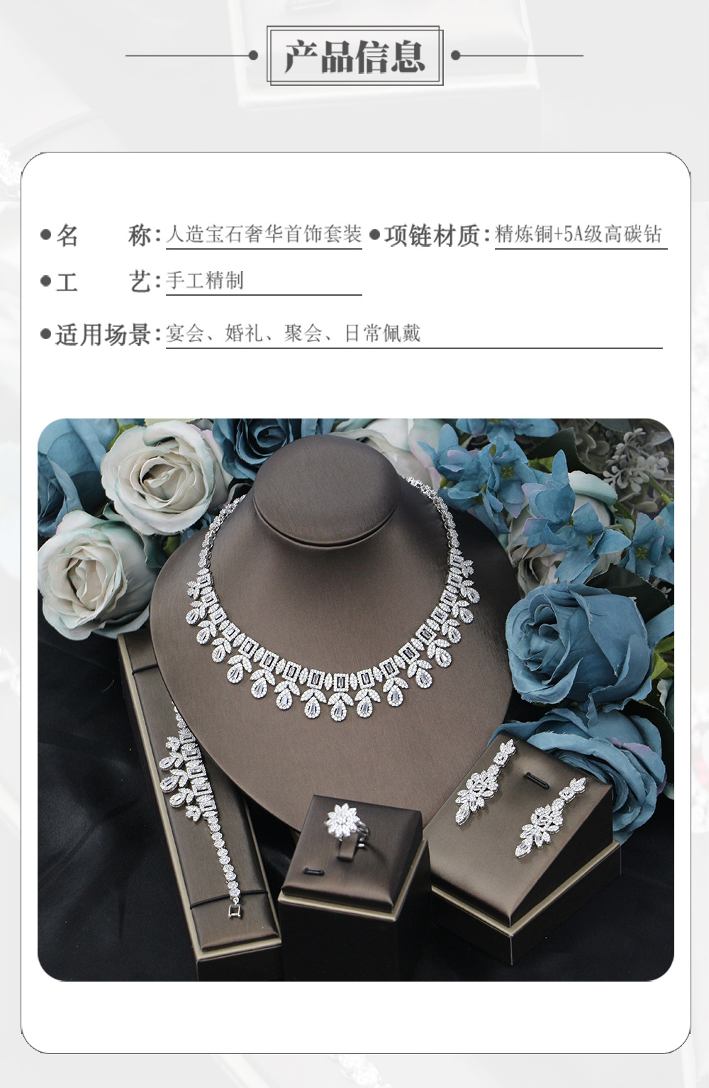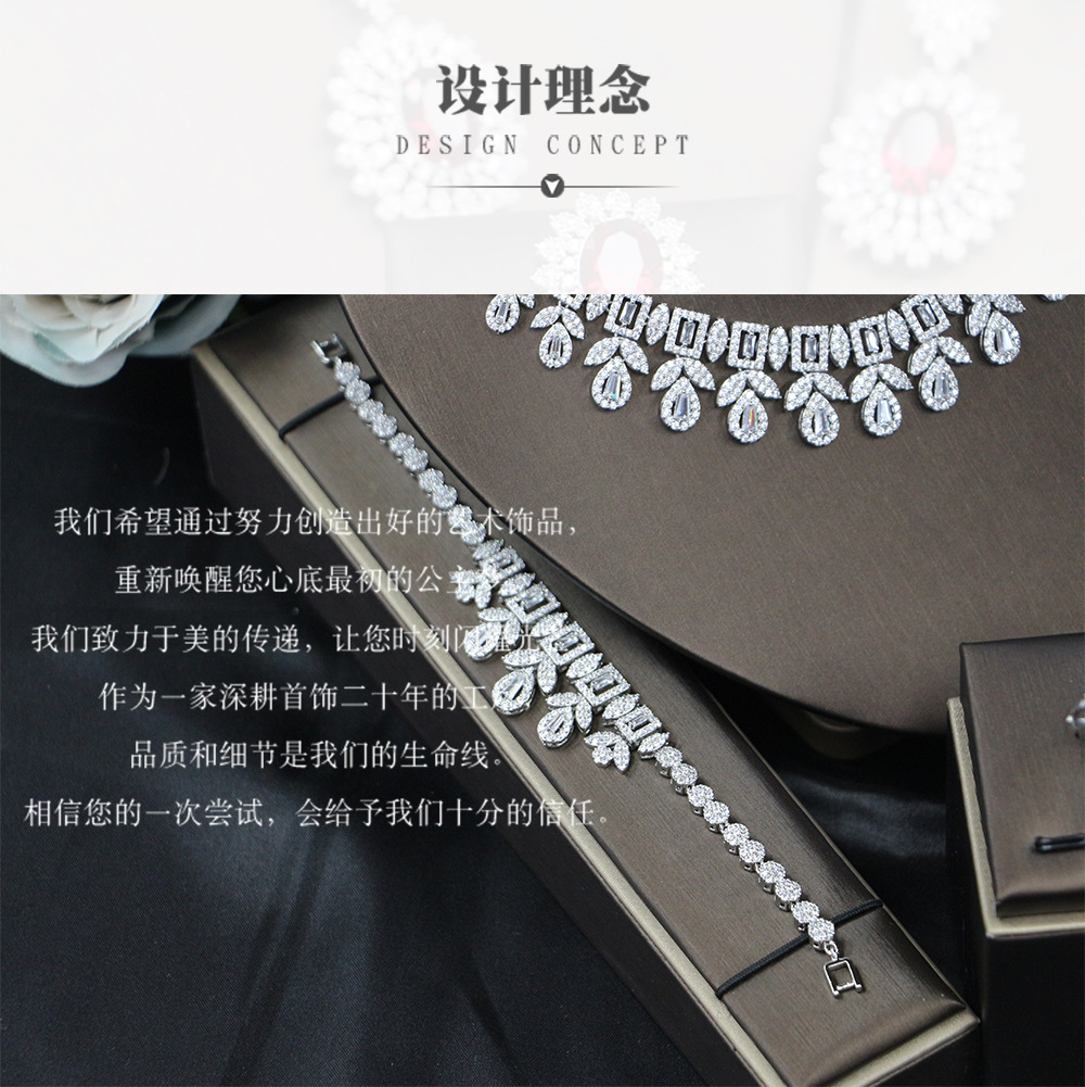 إكسسوارات فستان الزفاف، طقم من أربع قطع مرصع بالزركون: قلادة، أقراط، خاتم، سوار.
