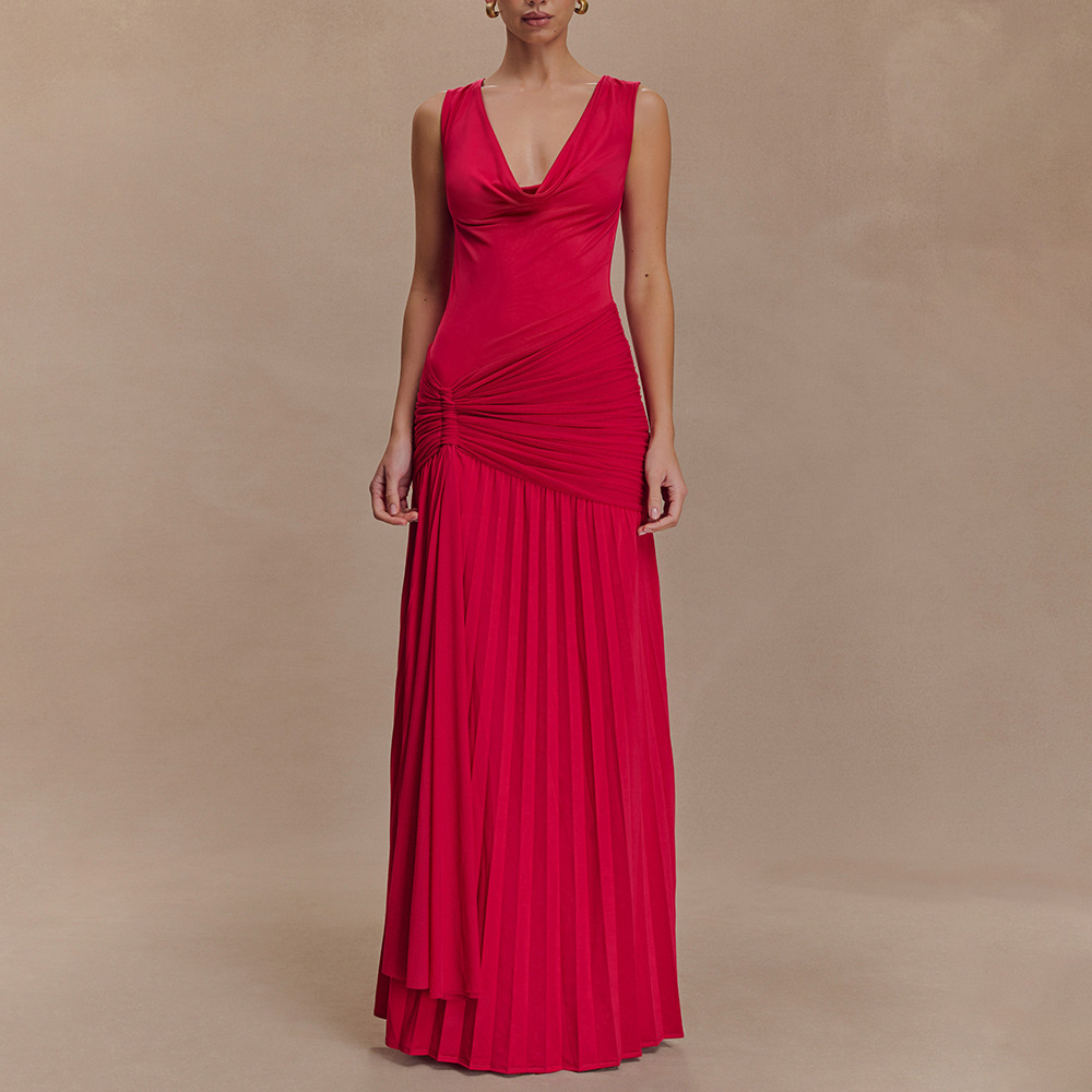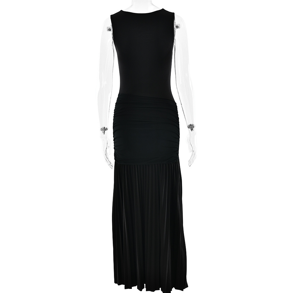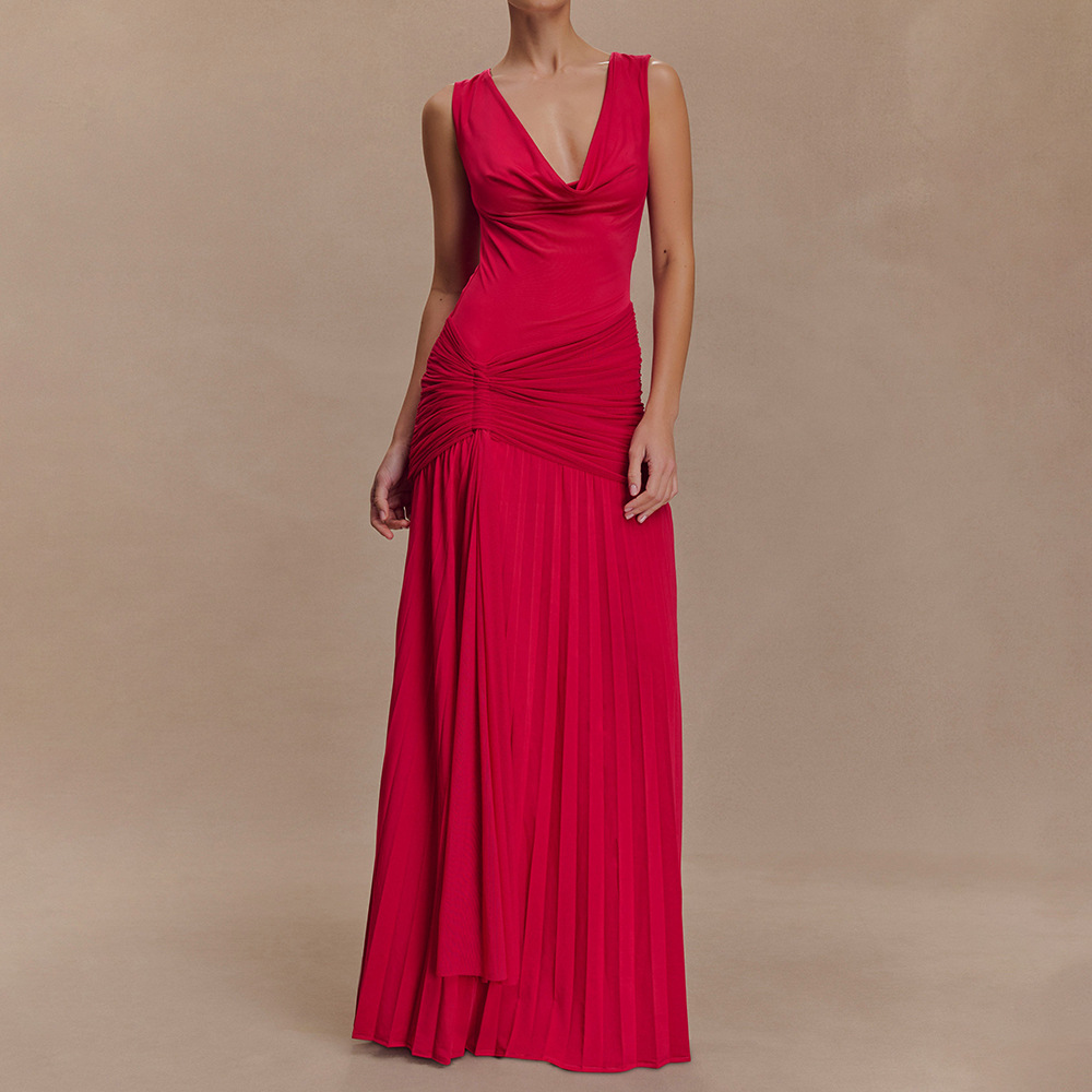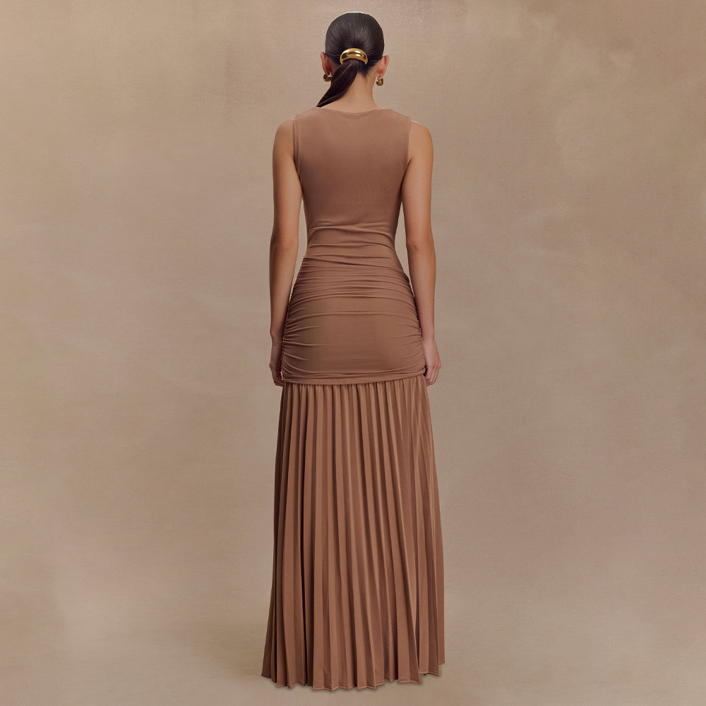 مصنوع من حرير الحليب + شبكة، مع طوق مكشكشة، بدون أكمام وتصميم مطوي
