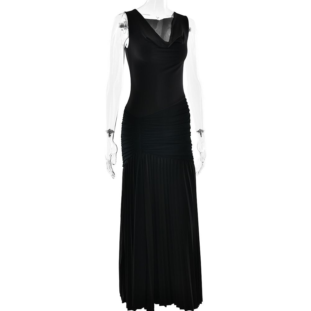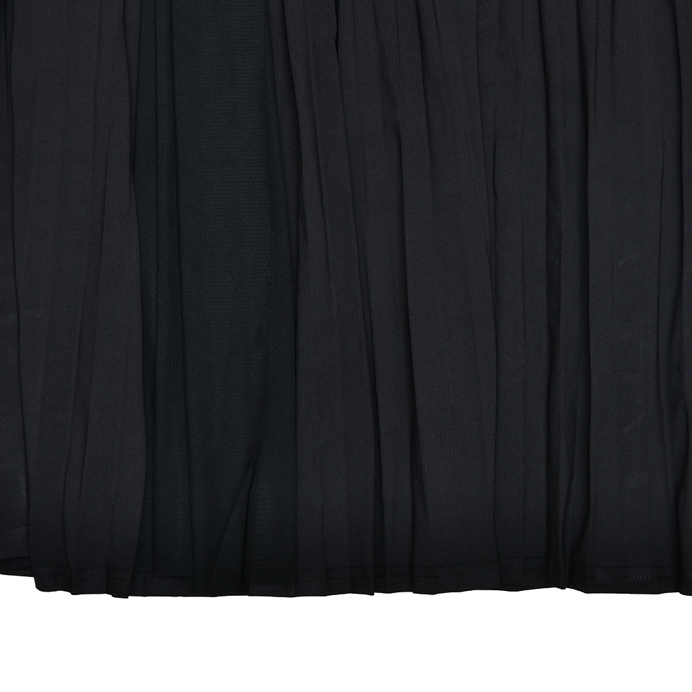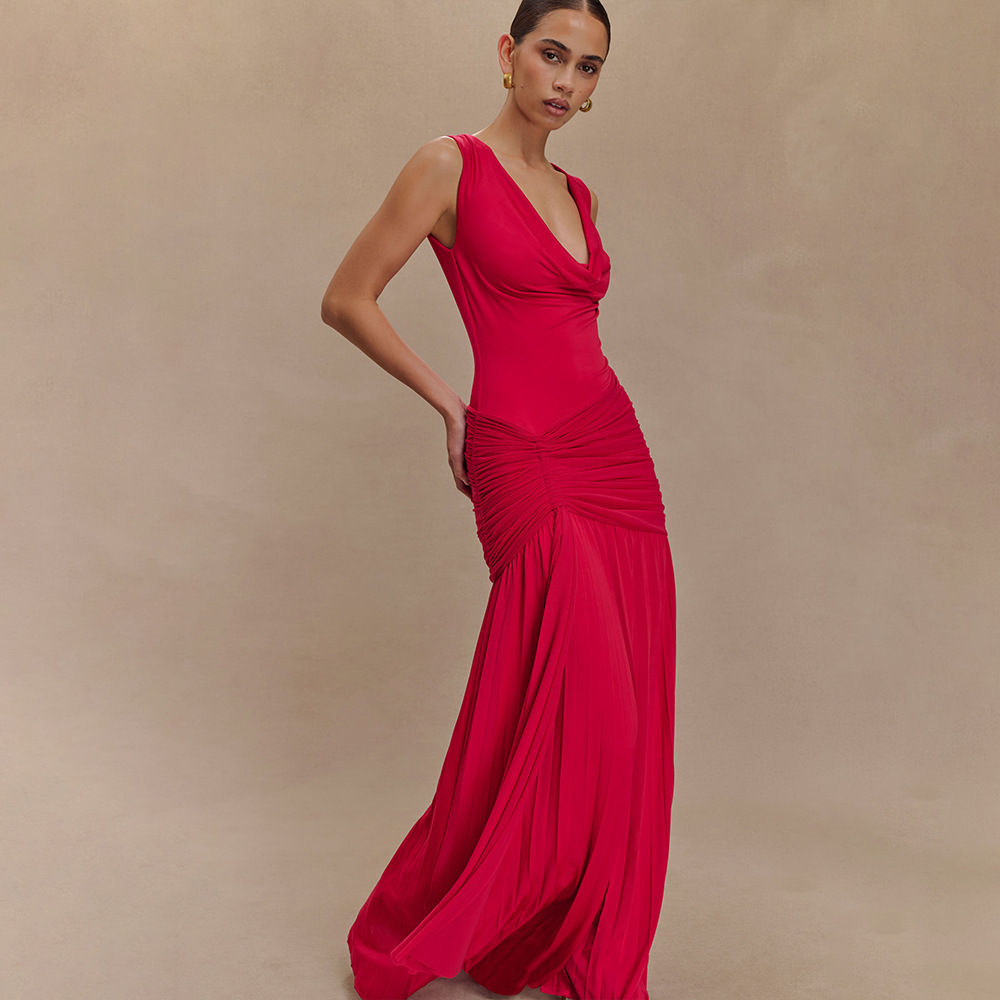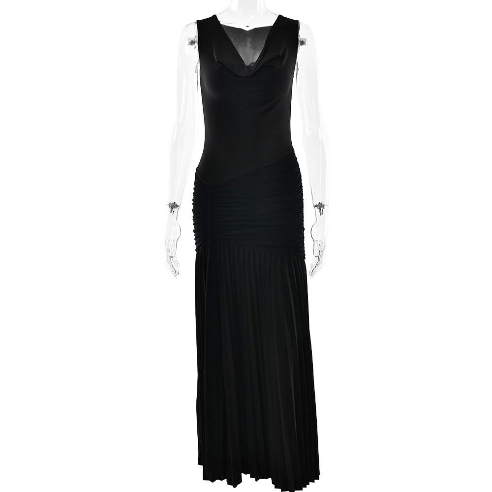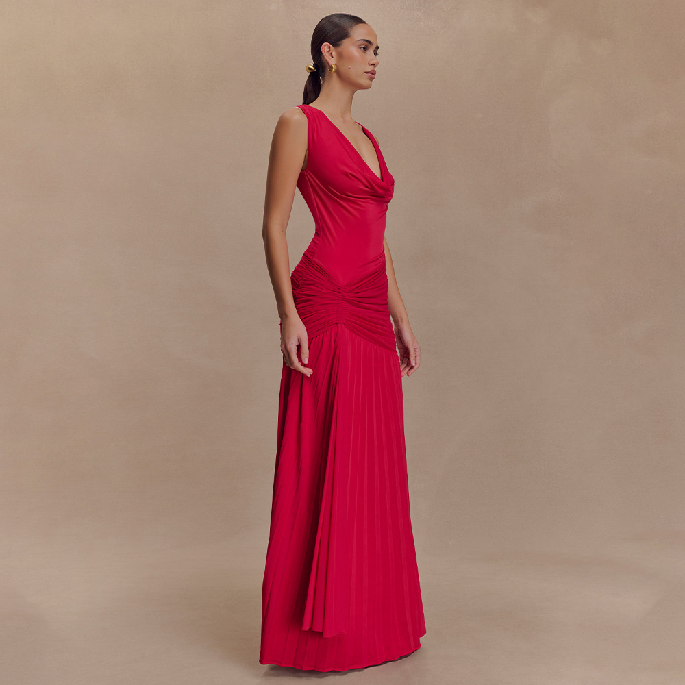 مصنوع من حرير الحليب + شبكة، مع طوق مكشكشة، بدون أكمام وتصميم مطوي
