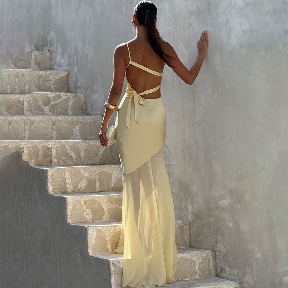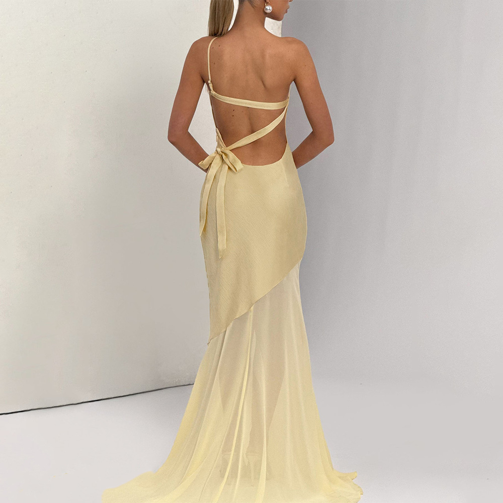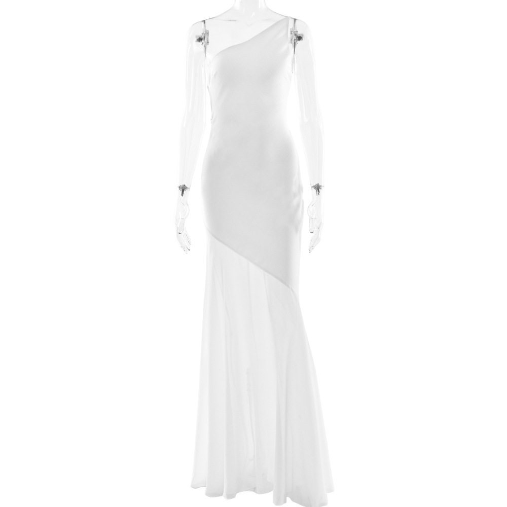 مصنوع من قماش الساتان والشبك، مع تصميم كتف مائل على الظهر